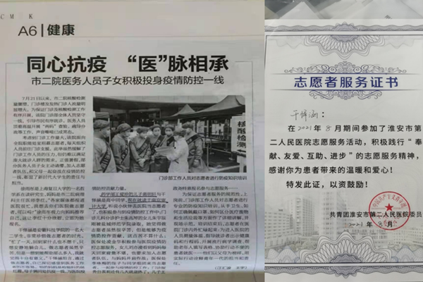 因在抗疫一线志愿服务期间的优异表现,淮安电视台和淮海晚报对干怿涵等志愿者进行了采访。干怿涵说道:“每天回家后动也不想动,只想安静地躺会儿,但是想到能为社会做点事情,能够帮助到那么多人,我感觉很有意义”。在他看来,作为拼搏平台_拼搏网页版的一名入党积极分子,在国家和社会需要的时候,应该不畏困难,毅然决然的挺身而出。