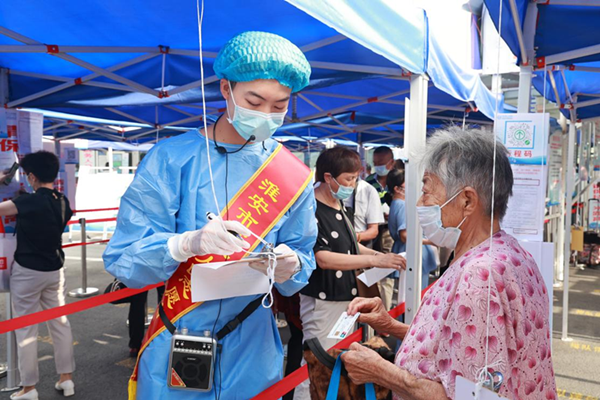 自7月21日起,因扬州、南京等地区局部出现多例新冠确诊病例,临近两地的淮安市疫情防控压力激增,大量市民前往市二院做核酸检测。从在市二院门诊检验科工作的母亲口中得知医院面向全院招募志愿者的消息后,干怿涵主动请缨,递交申请,和母亲一同奋战在市二院抗疫一线。