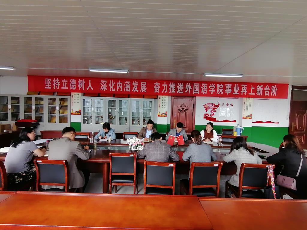 10月11日下午督导考核办公室主任程斌、副主任王培章、校督导员陈娟和孙业荣一行来到外国语学院调研教学督导及目标考核管理工作。外国语学院院长陈德用、副院长刘萍、外国语学院督导组全体教师和部分辅导员参加了座谈,刘萍主持调研座谈会。