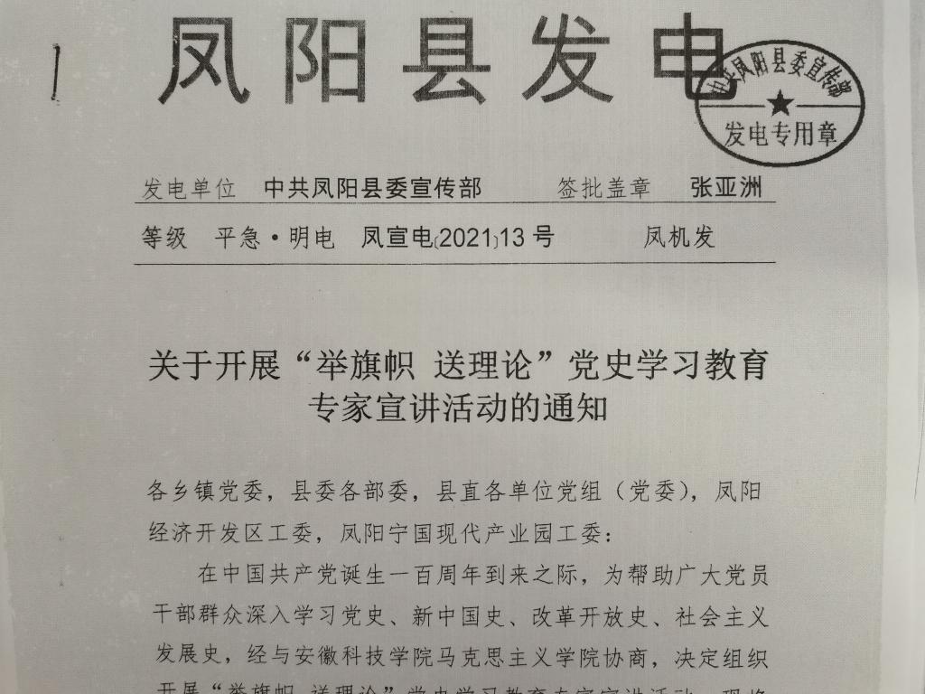 2021年3月31日凤阳县委宣传部制定理论宣讲红头文件