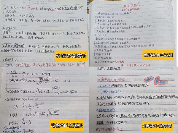 上交的笔记囊括了生物统计学、动物遗传学、动物生理学等课程。参与展评的笔记字迹工整、条理清晰、内容详尽、图文并茂,展现了同学们刻苦勤奋的学习态度和精益求精的积极风貌。记好课堂笔记是学生课堂学习的基本要求,笔记承载着教师的授课精华,是学习态度的体现。一份优秀的课堂笔记,不仅对课后复习有重要意义,更有利于培养独立学习的能力。