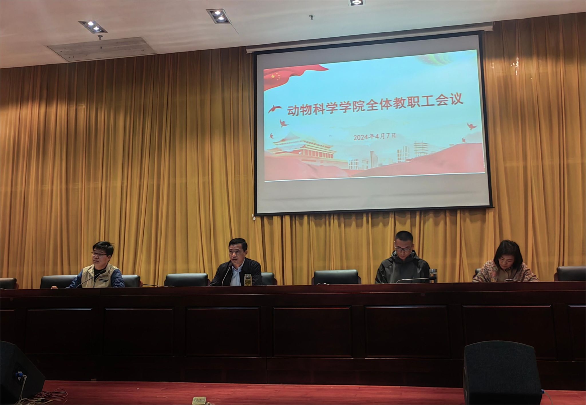 4月7日下午,动物科学学院在图书馆二楼报告厅,召开全体教职工大会,推进审核评估线上迎评等重点工作,学院党政班子成员及全体教职工参会。会议由学院党委书记、副院长程斌主持。