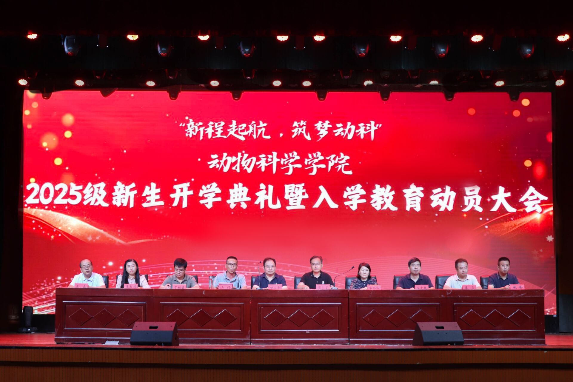 9月10日晚,动物科学学院2025级新生开学典礼暨入学教育动员大会及迎新晚会在凤阳校区大学生活动中心举行。学院党政领导、党委委员、各系(室、中心)主任、教师代表、全体辅导员、老生代表以及400余名新生共同参加了本次活动。典礼由学院党委副书记汤帅主持,在庄严的国歌声中正式开幕。