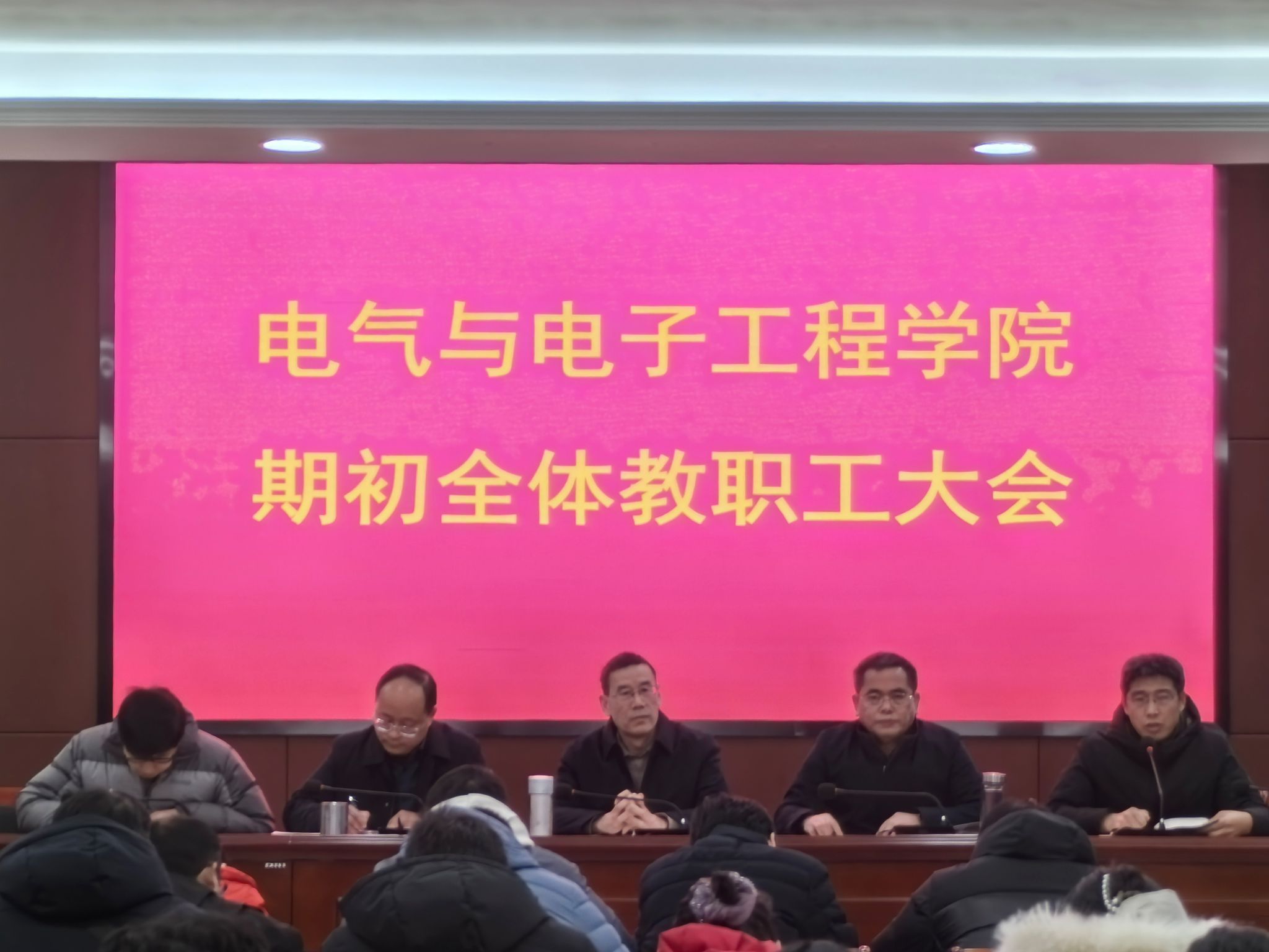 2月25日下午,电气与电子工程学院于西辅楼111会议室召开新学期全体教职工大会,学院党委书记骆海邦,党委副书记、院长夏显明,党委副书记、纪委书记尚磊,副院长国海,副院长樊晓宇及全体教职工参加了会议,会议由骆海邦主持。