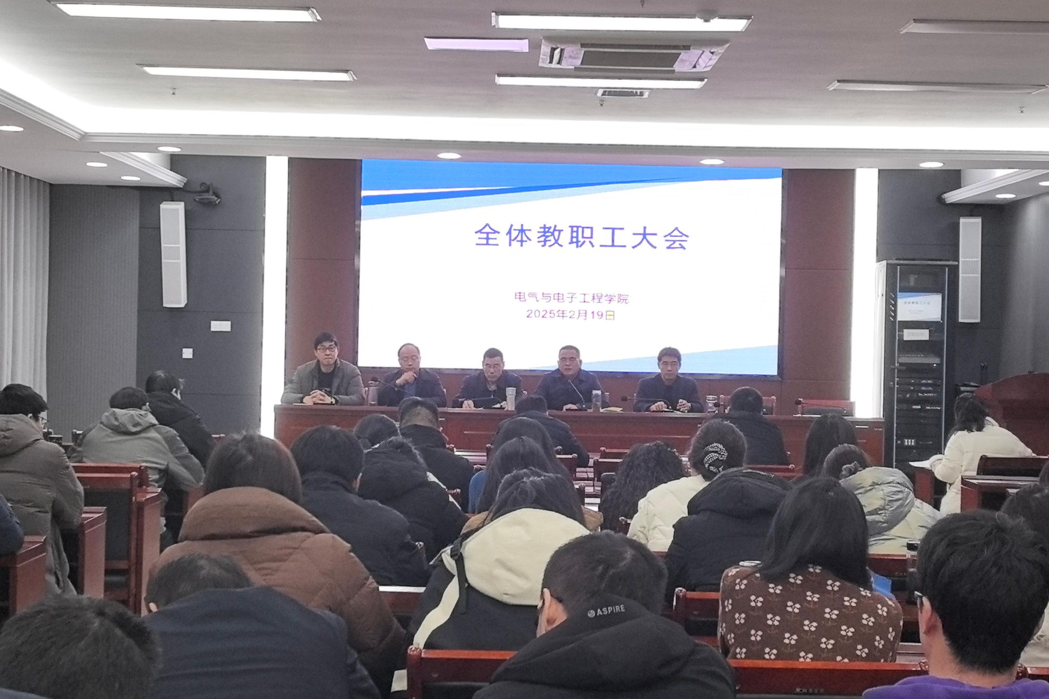 2月19日下午,电气与电子工程学院于西辅楼111会议室召开新学期全体教职工大会,学院党委书记骆海邦,党委副书记、院长夏显明,党委副书记、纪委书记尚磊,副院长国海,副院长樊晓宇及全体教职工参加了会议,会议由骆海邦主持。
