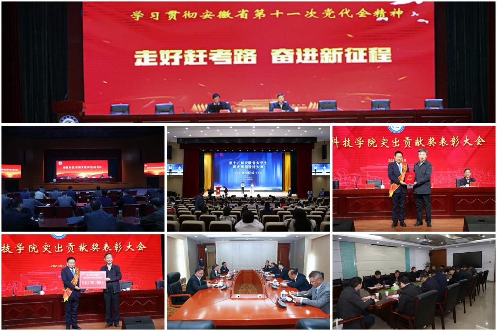 【综述】11月3日,我校召开党委理论学习中心组(扩大)学习会议,传达学习安徽省第十一次党代会和第26次全省高校党建工作会议精神,研究部署贯彻落实措施。党委书记蒋德勤主持会议并讲话。党委副书记、校长李震,党委委员、副校长黄远友,党委委员、纪委书记、监察专员王强,党委委员、副校长李升和出席会议;11月3日,我校在凤阳校区大学生活动中心召开本科教育教学审核评估动员会,校党委书记蒋德勤,党委副书记、校长李震,党委委员、副校长黄远友,党委委员、纪委书记、监察专员王强,党委委员、副校长黄友锐,党委委员、副校长李升和出席会议,蒋德勤主持审核评估动员会;11月7日,安徽省第十五届大学生职业规划设计大赛总决赛在我校龙湖校区成功举办,省委教育工委委员、省教育厅副厅长解平出席颁奖典礼并发表讲话。校党委书记蒋德勤在颁奖仪式上致辞,党委副书记、校长李震,党委委员、副校长黄友锐出席闭幕式并为获奖高校和个人颁发奖杯证书;11月11日,我校在凤阳校区大学生活动中心召开突出贡献奖表彰大会。校党委书记蒋德勤,党委副书记、校长李震,党委委员、副校长黄远友,党委委员、纪委书记、监察专员王强,党委委员、副校长黄友锐,党委委员、副校长李升和出席表彰大会。李震主持会议;11月20-21日,校党委书记蒋德勤,党委副书记、校长李震一行赴芜湖、宣城相关企业考察调研,洽谈合作事宜,推进校企合作共赢。安徽海螺集团有限责任公司、安徽优仕生物科技发展有限公司相关负责人以及我校党委(校长)办公室负责人等陪同考察调研;11月24日,我校召开学习贯彻习近平总书记“七一”重要讲话精神交流研讨会。党委书记蒋德勤主持会议,党委委员、副校长黄远友,党委(校长)办公室、宣传部、组织部、教师工作部、学工部等相关职能部门负责人出席会议,二级学院党委书记、院长、副书记、党支部书记、学生辅导员、离退休老党员、职能部门代表参加会议。
