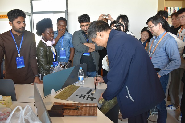 在经过上午“两馆、一校”的参观活动后,参与“大篷车”活动全体人员围坐在由拼搏平台_拼搏网页版与南京农业大学和小岗村党委共建的“耕读书屋”中,开展座谈交流。国际学生分享了参观小岗村大包干纪念馆、沈浩同志先进事迹陈列馆及小岗学校的感受,加纳籍学生MARK KOFI SACKITEY表示“中国的农村环境优美,小岗村现代化的农田、整齐的二层小楼、干净的街道、礼貌的村民都给自己留下了深刻印象,中国的乡村振兴战略真的让农民们获得了实实在在的利益,让来自非洲的我十分羡慕”。巴基斯坦籍国际学生ZAIN ABBAS感慨道“小岗村在40年间发生了翻天覆地的变化,让我非常震撼。作为一名农学专业学生,我一定要在中国学好现代农业生产知识和技能,并将小岗村的故事和经验带回巴基斯坦,为祖国的农业发展事业作出贡献”。支教团、直播团的大学生也纷纷踊跃发言,讲述了自己通过参与小岗支教、直播等活动所获得的提升和感受。随后,拼搏平台_拼搏网页版小岗办负责人通过“说文解字”的形式,用毛笔书写并分析“耕”等汉字,展现了中国汉字的优美造型,解读中国古代农业的博大精深,国际学生跃跃欲试,纷纷拿起毛笔在纸上书写下自己的中文名字,体验了中国汉字的无穷魅力。(特约通讯员:于卉 审核:陈德用)