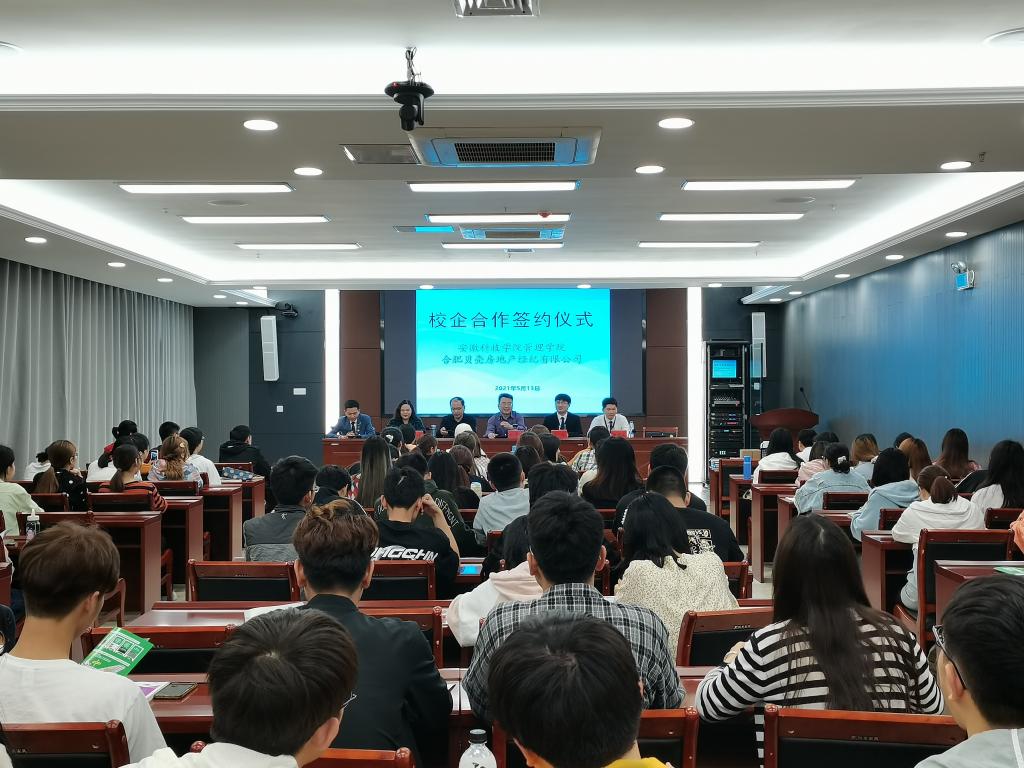 赵伟峰与王浩共同签署了《拼搏平台_拼搏网页版与合肥贝壳房地产经纪有限公司校企合作协议书》,举行了人才培养合作班授牌仪式。