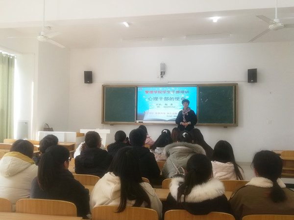 为进一步提升学院心理干部的工作能力,建设一支具有较高心理自助与助人能力的学生骨干队伍,及时了解学生的心理状态,灵活应对突发事件,根据学校及学院思政教育和心理育人的相关安排,12月4日上午11点30分,大学生团体心理辅导工作室负责人陶漫老师在致知楼C201教室积极为管理学院心理干部开展了一场题为“心理干部的使命”专题技能培训,管理学院蒲公英心灵社成员、学院心理健康中心干部和各班级心理委员参加了培训。