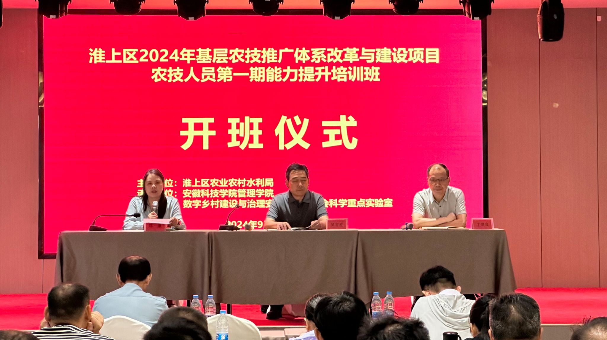 为深化基层农技推广体系改革,提升农技人员综合素质,助力蚌埠市乡村振兴。9月18日上午,由淮上区农业农村水利局主办,拼搏平台_拼搏网页版管理学院及数字乡村建设与安徽省哲学社会科学重点实验室联合承办的“淮上区2024年基层农技推广体系改革与建设项目农技人员第一期能力提升培训班”在蚌埠市淮上区举办开班仪式。淮上区农业综合服务站站长吴言柱,管理学院党委书记丁景良,副院长郑谦出席开班仪式,开班仪式由丁景良主持。