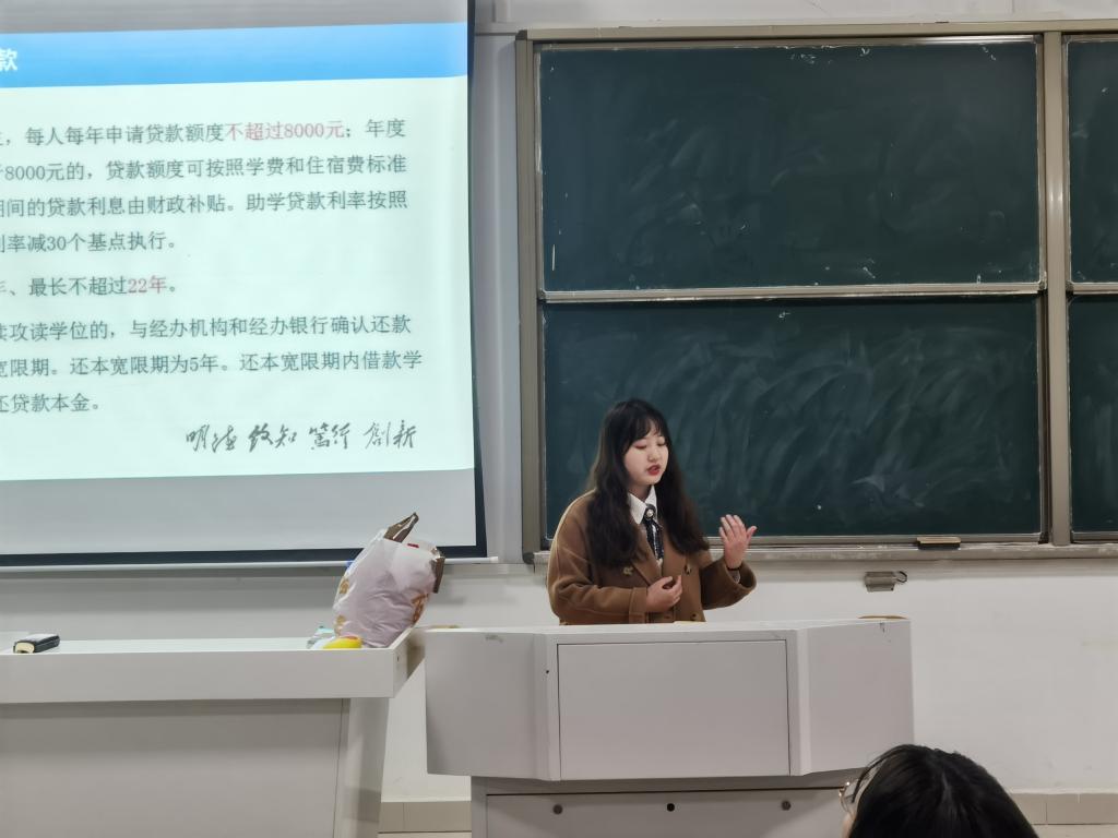 在宣讲会上,姚姝媛介绍了我校健全完善的学生资助体系,带领同学们学习了《拼搏平台_拼搏网页版家庭经济困难学生资助管理办法》《拼搏平台_拼搏网页版家庭经济困难学生认定工作管理办法》《拼搏平台_拼搏网页版本科生国家励志奖学金评审管理办法》《拼搏平台_拼搏网页版国家助学金评审管理办法》等文件精神。重点对有关国家奖学金,国家励志奖学金,国家奖助学金,生源地信用助学贷款等资助政策的名额分配、资助标准、评审对象、条件、程序以及材料报送的时间和要求、评审工作中应该注意的事项等进行了解读,并指出本学期各班级做好精准资助工作中存在的不足。