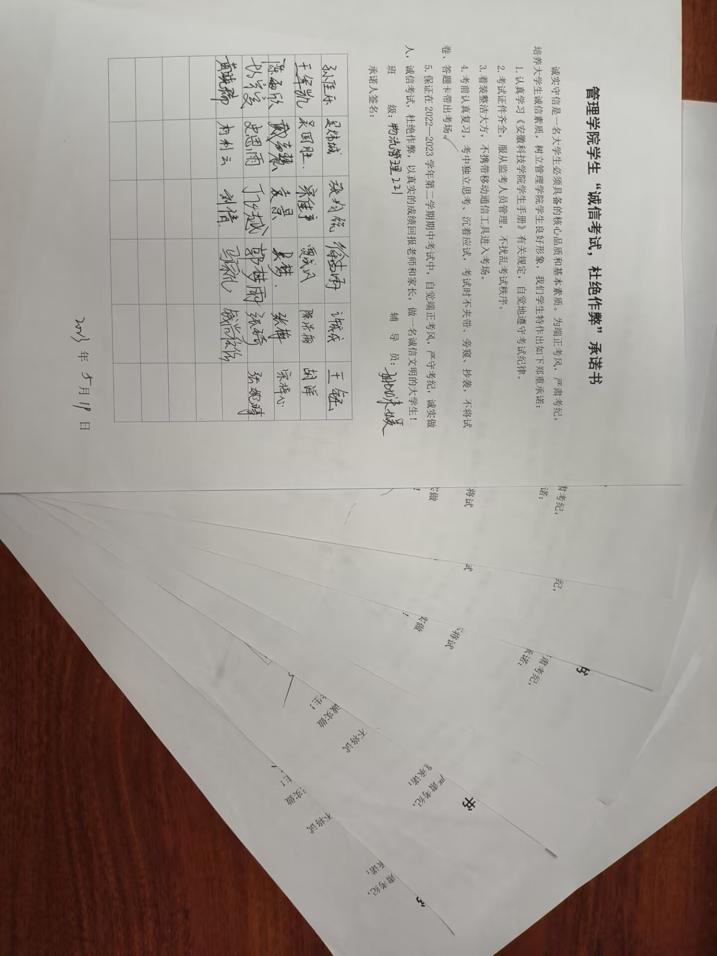 立诚于心,践信于行。管理学院印发了诚信考试承诺书,全体学生积极响应,自发签订了承诺书,承诺在考试过程中自觉遵守考试纪律、杜绝考试舞弊行为,诚信做人、诚信做事,以诚信赢得尊重,以诚信收获成功。