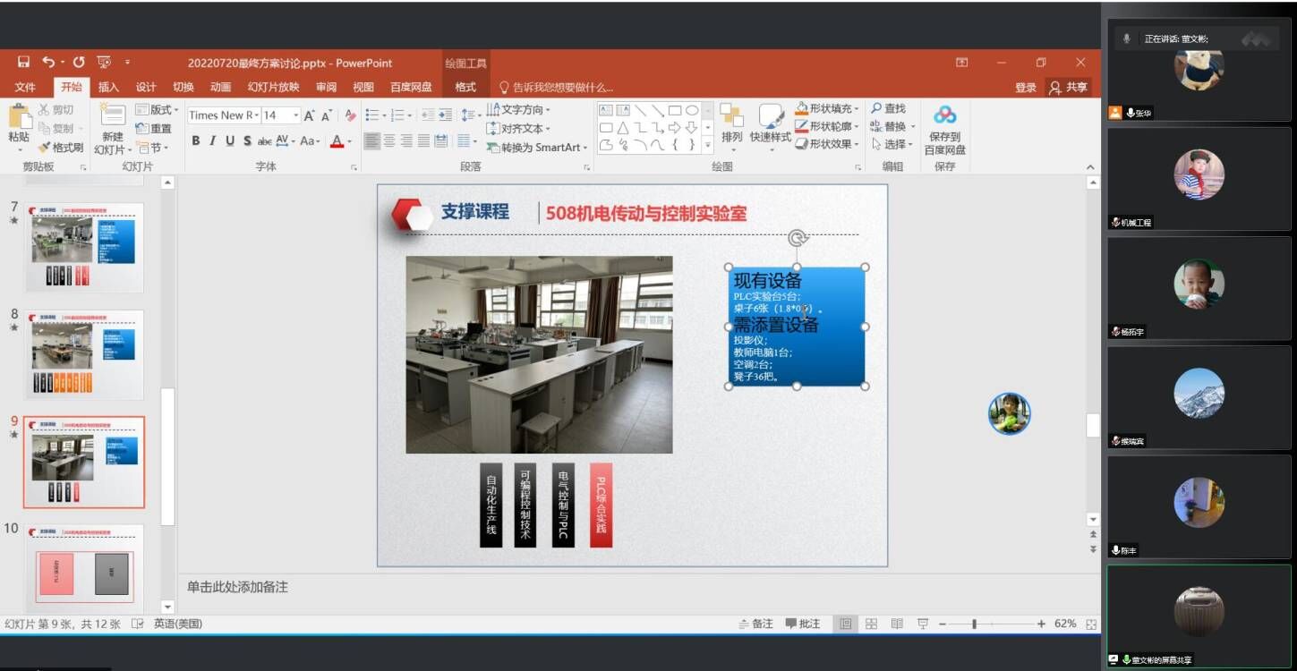 针对实验室存在问题及不合理现象,机械工程学院于2022年7月20日专门召开由学院领导、各系正副主任、实验中心正副主任及相关专业负责人参加的线上研讨会。会上,大家集思广益,各抒己见,针对存在问题进行充分讨论,基本确定了各实验实训中心专业核心实验室整合优化方案。
