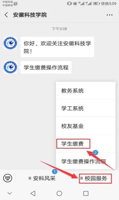 1.点击“拼搏平台_拼搏网页版微信公众号”界面右下角“学生缴费”菜单。