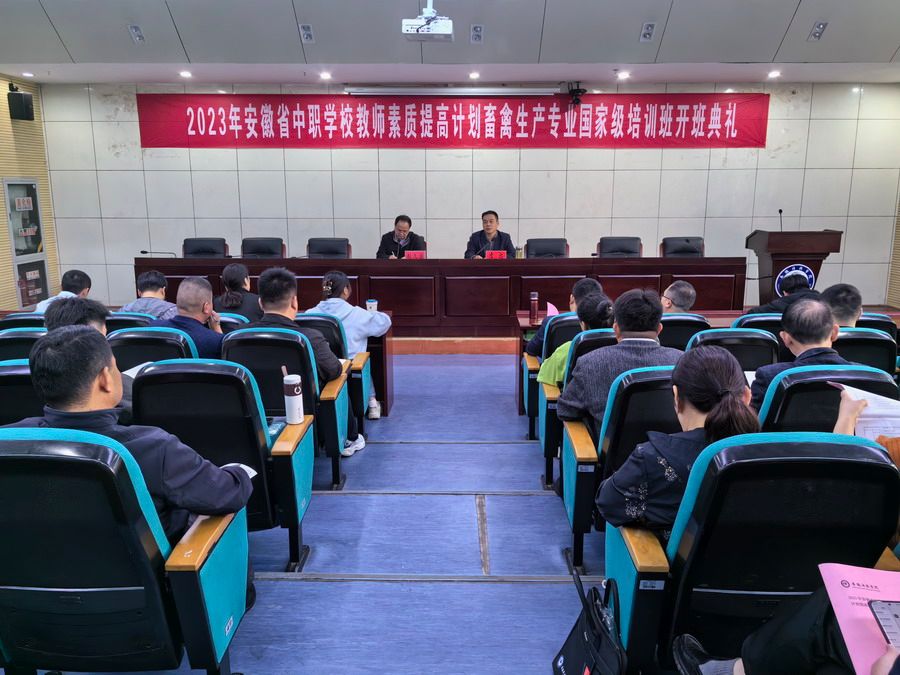 为促进我省职业院校教师队伍建设,不断提升中等职业学校教师教育教学能力和科研能力,促进中等职业教育“双师型”教师数量和质量提升,根据《关于做好安徽省 2023 年度中职教师素质提高计划国家级培训工作的通知》(皖中师〔2024〕1号)的文件精神,4月16日,由我校承办的2023年安徽省中职学校教师素质提高计划畜禽生产专业国家级培训班在校会议中心第一报告厅顺利开班。来自全省各中职学校的近30名骨干教师及我校继续教育学院副院长(主持工作)李忠、培训班相关工作人员及教师代表等参加了开班仪式。仪式由继续教育学院副院长张文国主持。