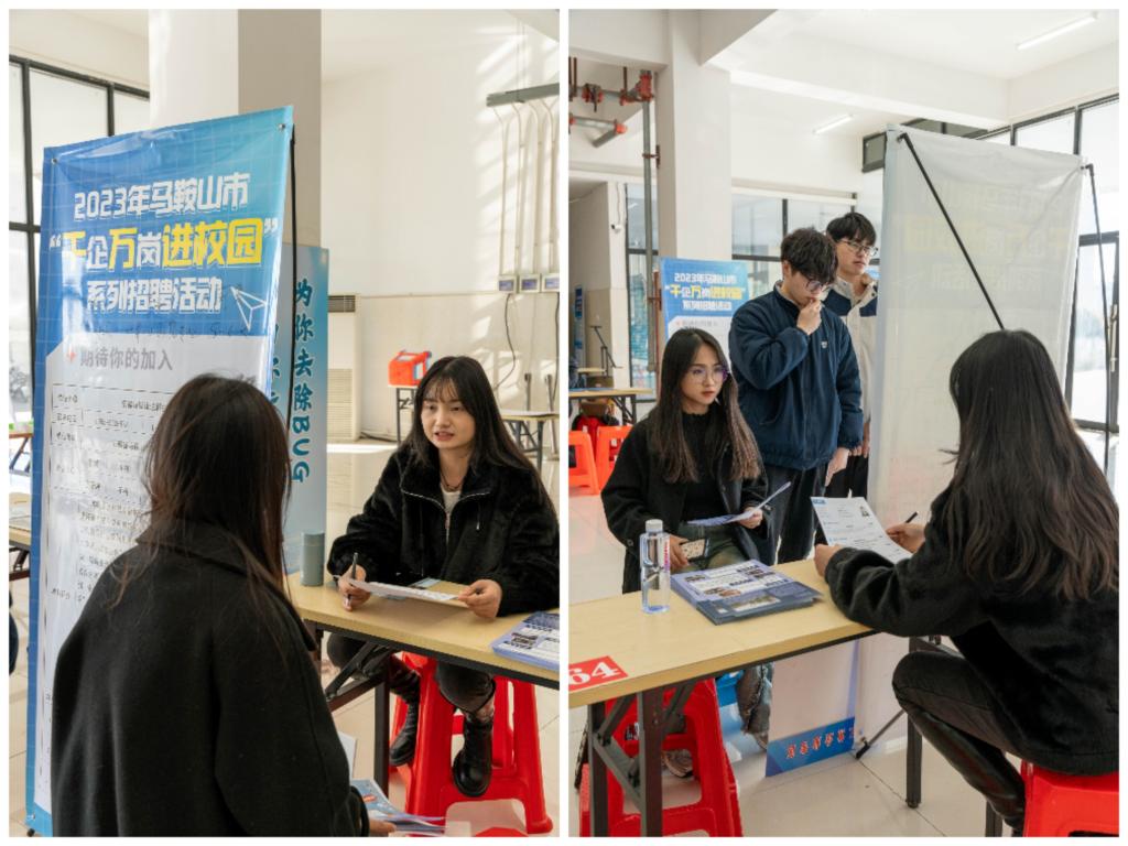 学校持续对接地方人社部门,联动校友资源,邀请安徽瑞斯康达科技有限责任公司、安徽华星化工有限公司、安徽紫江喷铝环保材料有限公司等23家头部企业、合肥及蚌埠的8家校友企业进校招聘,累计提供865个优质就业岗位。200多名毕业生参加招聘会,积极投递简历。化学与材料工程学院的屈佳龙和徐桂明同学现场面试,现场签约,同安徽紫江喷铝环保材料有限公司网签三放协议。