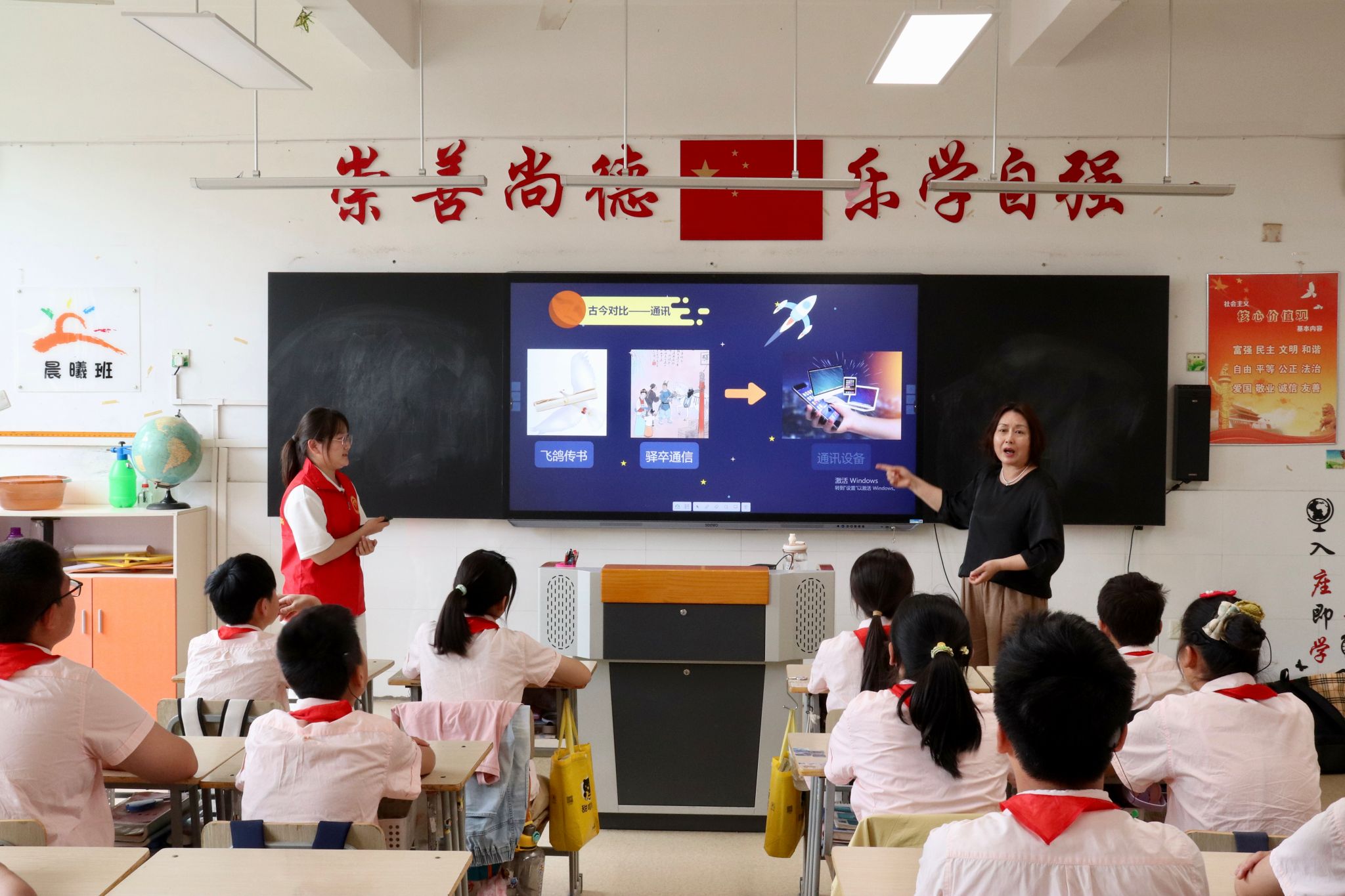 紧接着,实践团成员任雨荷站在讲台前,巧妙地用孩子们易于理解的语言,为孩子们讲解这些令人瞩目的科技成果背后的故事和原理。从交通的发展谈到通信的革新,再到航天的探索,任雨荷不仅讲述了技术的演变,还深入挖掘了每一个进步背后的科学家们的不懈努力和创新精神。在解答孩子们提出的疑问时,任雨荷总是耐心而细致,她鼓励孩子们勇敢提问,让孩子们在轻松愉快的氛围中,感受到了科技的魅力和探索的乐趣。