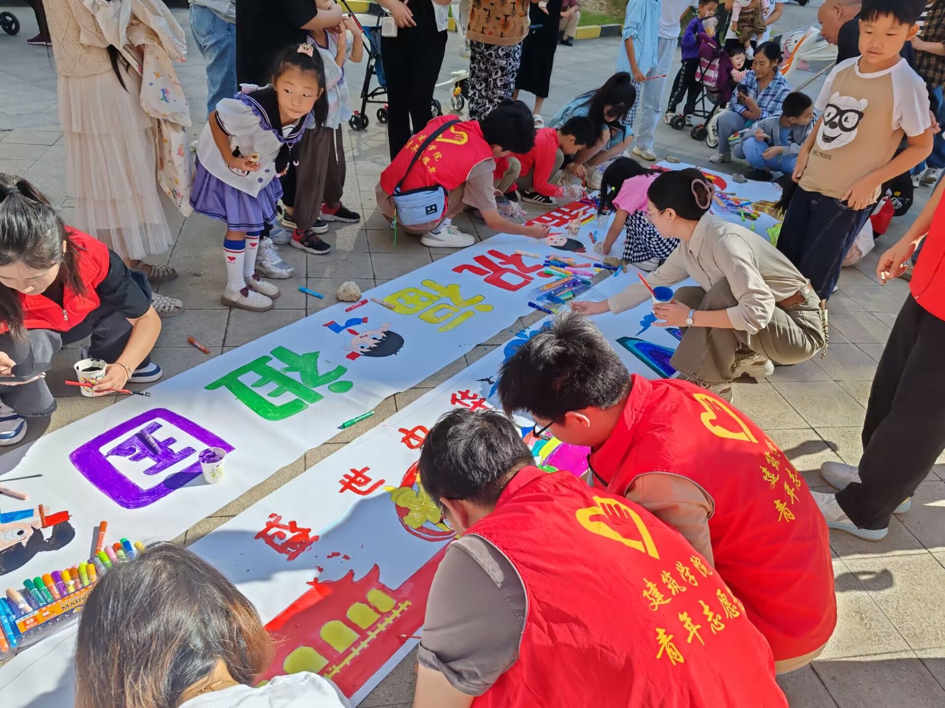 在智慧锦城小区,建筑学院青年志愿服务站成员带领小区青少年开展国庆画卷手绘活动。活动期间,志愿者们在孩子中间穿梭不停,耐心地指导孩子们调色、构图和绘制,积极鼓励孩子们充分发挥想象,把对祖国的深深热爱倾注于画笔之下。这次活动不仅成为了一次艺术创作的盛宴,更是一次爱国主义教育的生动实践。