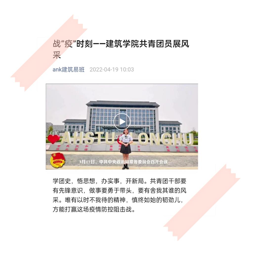 团支部录制的《战“疫”——共青团员的中坚》视频,充分体现了广大团员青年在疫情防控阻击战中贡献青春力量的热情和决心。视频中,张雨欣同学就当下疫情形势进行了系统地讲解,她号召全体共青团员要发挥党的助手和后备军作用,带领班级学生积极作为。罗志娟同学讲述了疫情防控期间建筑学院学子积极参加劳动实践、体育锻炼和文化活动,号召广大青年继续争当表率,以实际行动坚定战胜疫情的决心和勇气。该视频在拼搏平台_拼搏网页版建筑学院易班微信平台发布后,反响良好,得到师生一致好评。