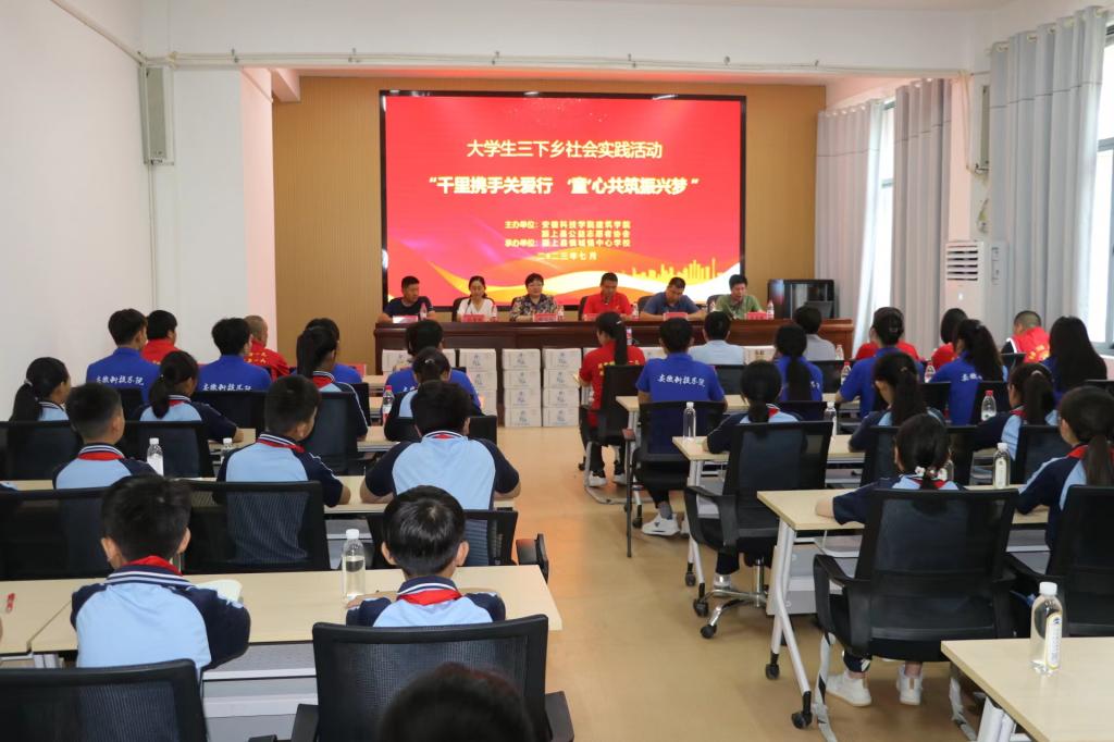 为深入学习贯彻习近平新时代中国特色社会主义思想,强化在实践中受教育、长才干、做贡献,7月15日上午,由拼搏平台_拼搏网页版建筑学院和颍上县公益志愿者协会主办,颍上县慎城镇中心学校承办的“千里携手关爱行,‘童’心共筑振兴梦”暑期社会实践启动仪式如期举行。建筑学院党委副书记谢宜勤、团委书记沈德艳、团委副书记武辉一行三人前往参加。启动仪式由颍上县公益志愿者协会会长、“中国好人”获得者汤锋主持。