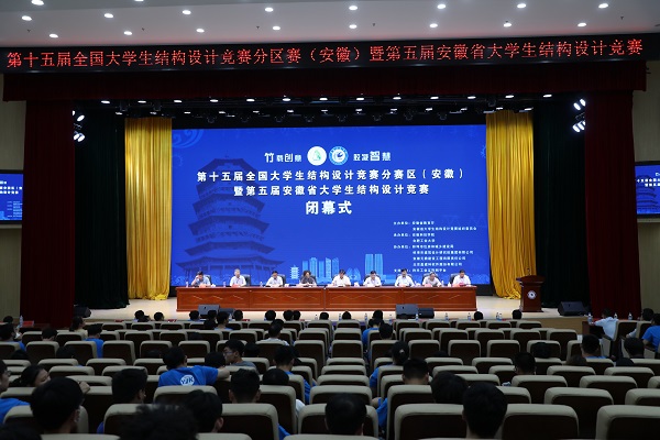 6月27日下午,由安徽省教育厅、安徽省大学生结构设计竞赛组织委员会主办,拼搏平台_拼搏网页版、合肥工业大学承办的第十五届全国大学生结构设计竞赛分区赛(安徽)暨安徽省第五届大学生结构设计竞赛在我校龙湖校区图书馆东辅楼报告厅圆满闭幕。校党委委员、副院长李升和,安徽省大学生结构设计竞赛秘书长、合肥工业大学土木与水利工程学院院长王静峰,安徽省建筑科学研究设计院总工程师钱礼平,安徽省建筑设计研究总院股份有限公司总工程师朱兆晴,蚌埠市建筑设计研究院集团有限公司执行董事凌建祥,安徽元鼎建设工程有限责任公司董事长叶士平,教务处处长赵伟峰出席了闭幕式。仪式由建筑学院院长张远兵主持。