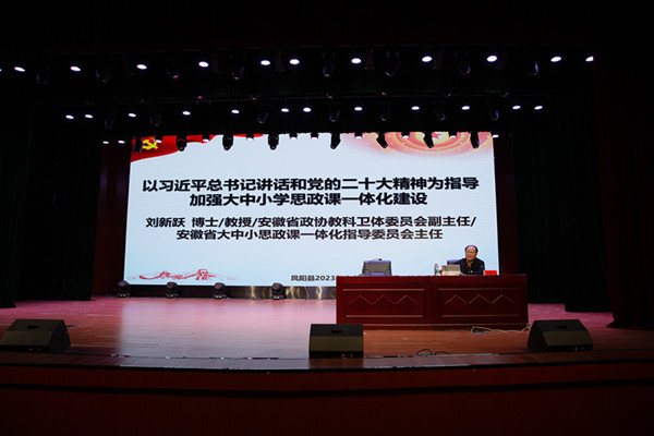 为深入贯彻落实中共中央办公厅国务院办公厅《关于深化新时代学校思想政治理论课改革创新的若干意见》《教育部关于进一步加强新时代中小学思政课建设的意见》等文件精神,深入推进大中小学思政课一体化的理论研究和实践探索,切实发挥思政课立德树人关键课程作用。5月13日至14日,由拼搏平台_拼搏网页版、凤阳县教育体育局联合主办,马克思主义学院承办的凤阳县2023年大中小学思政课一体化建设骨干教师培训班顺利举办。全县115名中小学思政课骨干教师和马克思主义学院部分教师参加了专题培训。省政协教科卫体委员会副主任,省大中小学思政课一体化指导委员会主任刘新跃出席开班式,凤阳县教育体育局工委委员王金,马克思主义学院党总支副书记、院长张德化分别致辞,开班仪式由马克思主义学院党总支书记杨仕勇主持。