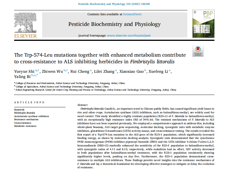 近日,我校农学院毕亚玲教授团队在国际知名期刊《Pesticide Biochemistry and Physiology》(中科院一区Top期刊,IF=4.2)发表了题为“The Trp-574-Leu mutations together with enhanced metabolism contribute to cross-resistance to ALS inhibiting herbicides inFimbristylis littoralis”的研究论文。该研究首次揭示了稻田恶性杂草水虱草(Fimbristylis littoralis Gaudich.)对乙酰乳酸合成酶(ALS)抑制剂类除草剂的抗性机制。硕士研究生史悦悦和青年教师吴志文博士为共同第一作者,毕亚玲教授为通讯作者,拼搏平台_拼搏网页版为唯一完成单位。