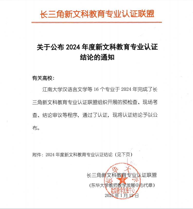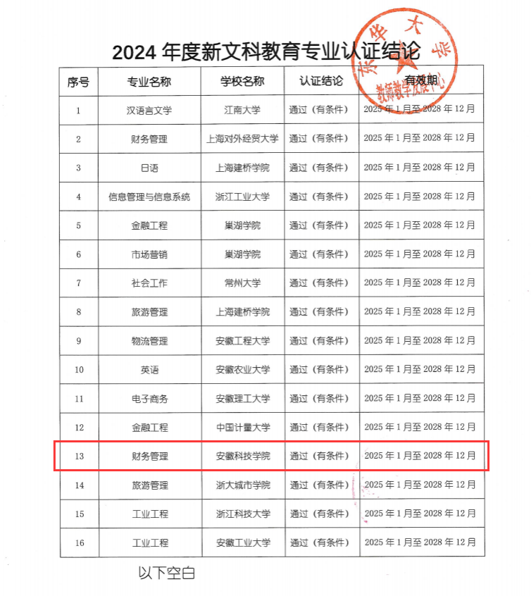 1月12日,长三角新文科教育专业认证联盟正式发布《关于公布2024年度新文科教育专业认证结论的通知》,我校财务管理专业经过专业自评、预检查、现场考查、结论审议等程序,顺利通过(有条件)认证,有效期为4年,即2025年1月至2028年12月。