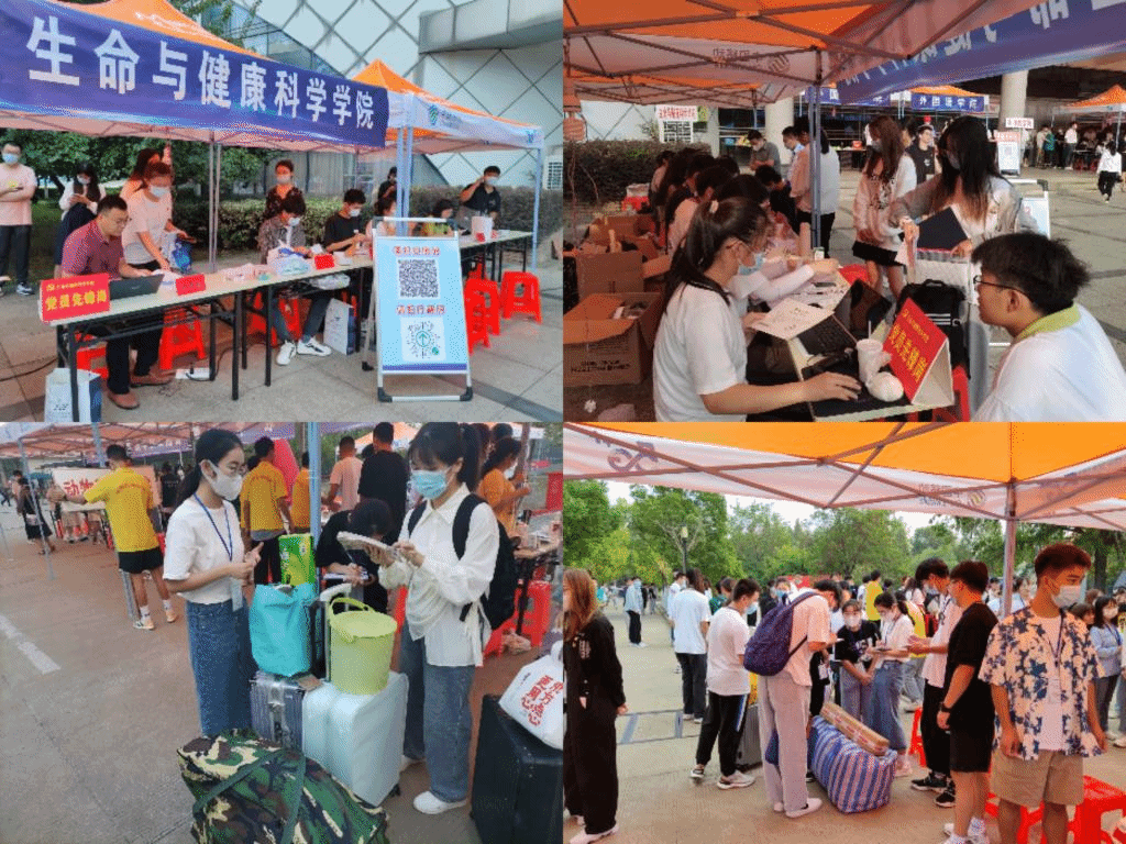 迎新过程中,校园里随处可见那群可爱可敬的志愿者们。他们有的负责在学院大本营的检录报到事宜,坐在帐篷里,一坐就是一整天,温柔细心;有的进行测温消毒工作,守好新生报道的第一关;有的在学院大本营等待,随时准备带领新生们去宿舍以及核酸检测工作;还有的在满校园四处奔波,忙忙碌碌只为确保新生的行李送达宿舍。