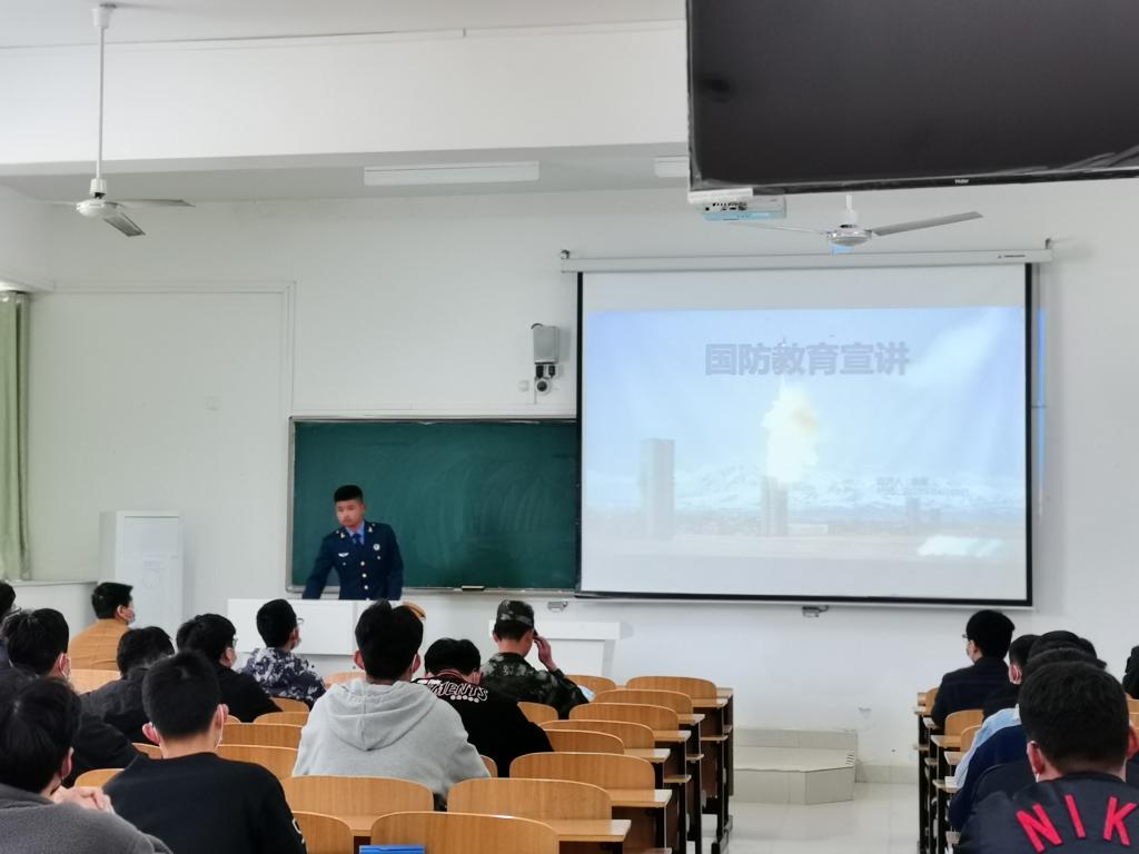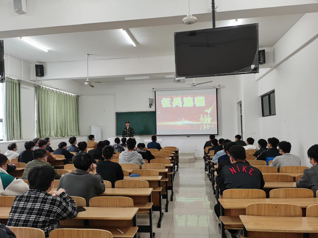 四位退役大学生着装齐整、逐一宣讲。他们生动详细讲述了部队的日常训练、军旅的业余生活、大学生当兵的优待政策、参军入伍的主要流程、退伍后的发展空间。他们声情并茂的讲解,图片并茂的展示,矫健挺拔的身姿,赢得听众的阵阵掌声和啧啧赞叹。闻兵老师介绍了学校大学生征兵的整体情况,并和与会学生进行交流互动。