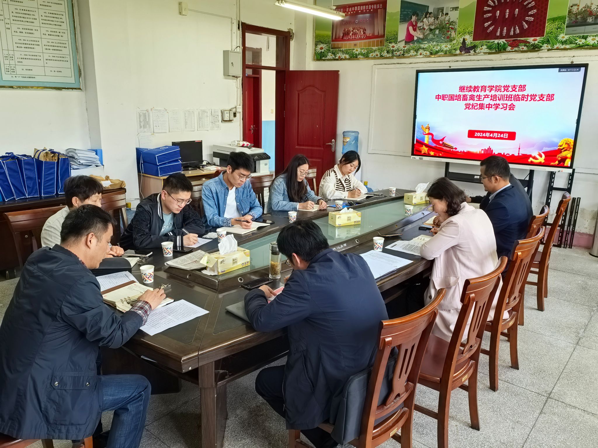 4月24日上午,继续教育学院党支部、中职国培畜禽生产培训班临时党支部在学知楼101学院会议室召开党纪学习教育专题学习交流会。会议由继续教育学院党支部书记、副院长李忠(主持工作)主持,继续教育学院党支部和中职国培畜禽生产培训班临时党支部全体党员参加。