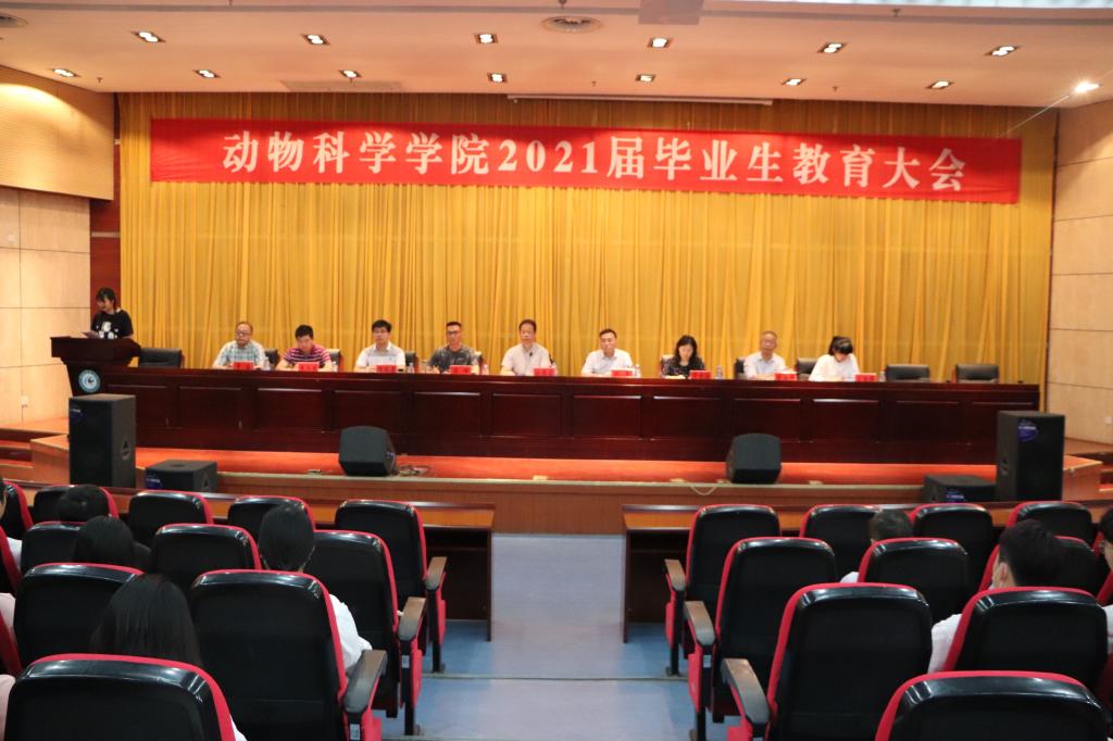 为切实做好毕业生毕业教育及离校工作,5月31日上午9时,动物科学学院在新图书馆二楼报告厅举行2021届本科硕士毕业生教育大会。动物科学学院党委副书记、院长刘德义教授,党委书记姚勇、党委副书记汤帅、副院长华金玲教授,党委委员、副院长贺绍君教授,党委委员蔡治华教授、动物医学系主任李文超教授、动物科学系主任王淑娟副教授,基础兽医学教研室主任李磊副教授等出席大会。出席大会的还有全体辅导员、毕业班班主任、教师代表、在校生代表和全体2021届毕业生。会议由刘德义主持。