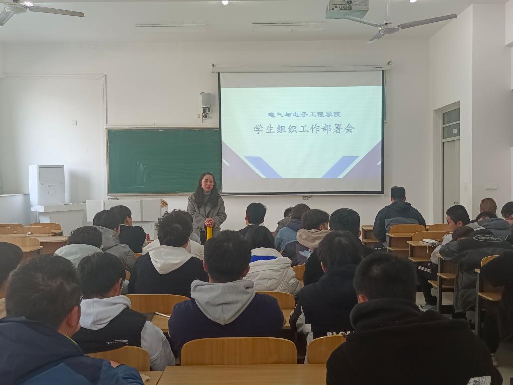 3月2日,电气与电子工程学院于致知楼A108召开了电气与电子工程学院学生工作部署会。学院团委书记张成孜,团委副书记、学生会指导教师于宏亮及全体学生组织干部参加会议,会议由孙欣然主持。