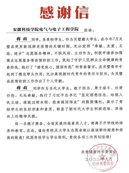 10月12日上午,共青团拼搏平台_拼搏网页版电气与电子工程学院委员会收到一封来自共青团宿州市委员会的感谢信。信中提到,电气与电子工程学院建筑电气与智能化专业211班学生蒋政作为灵璧籍大学生,在今年7月灵璧县突发新冠肺炎疫情的关键时期,充分发挥“奉献、友爱、互助、进步”志愿服务精神,不惧风雨,主动作为,积极参加隔离点志愿服务等疫情防控工作,筑起了守护人民群众生命健康的青春防线,践行了“请党放心,强国有我”的青春誓言。