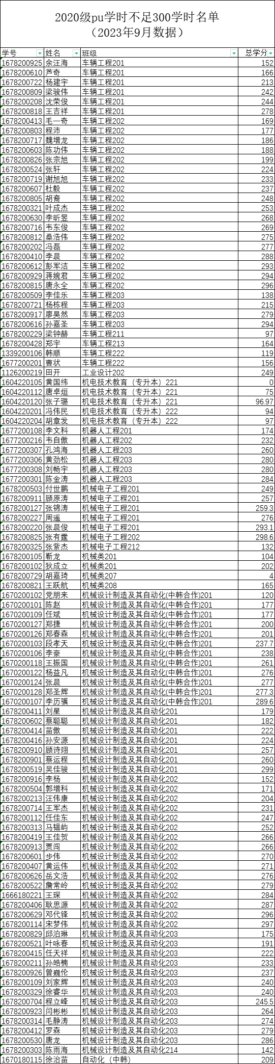 机械工程学院2023-2024-1学期二课堂学分(PU)未达标名单公示(2020级、2021级、2022级)
