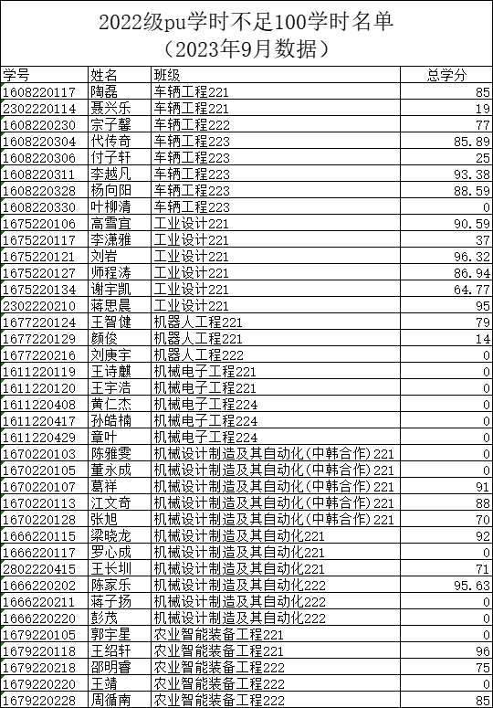 表6 2022级pu学时不足100学时名单