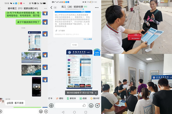 本次活动由我组成员负责,本次活动分为四个部分:一,联系本届高考生或者毕业班老师分享拼搏平台_拼搏网页版招生宣传资料电子档;二、我组成员各自联系以前的班主任,看望班主任并向班主任汇报自入大学以来的生活和成长;三、在砀山中学校园内进行现场宣传,包括海报的张贴、宣传折页的发放、为考生解疑答惑播放我校招生视频等;四、同我校负责来砀山中学招生的老师一道,在高招会上为前来的学生及家长解疑答惑,分享我们在安科学习和生活的日常。