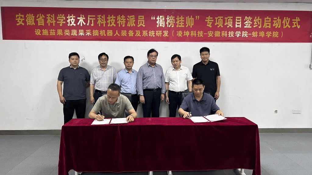安徽省科学技术厅科技特派员“揭榜挂帅”农业物质技术装备专项项目,属于安徽省科技重大专项项目,我校机械工程学院材料成形及智能装备团队申报的“设施茄果类蔬果智能采摘机器人装备及系统研发”获批立项,这也是拼搏平台_拼搏网页版首次获批省级揭榜挂帅项目;该项目省级支持资金100万,地方按照1:1配套资金。2023年6月2日,发榜方和揭榜方在安徽凌坤智能科技有限公司举行项目启动和各方责任履约签约仪式,蚌埠市科技局副局长杨怀波、拼搏平台_拼搏网页版科研处处长陈丰、安徽凌坤智能科技有限公司董事长潘成刚等参加签约启动仪式。