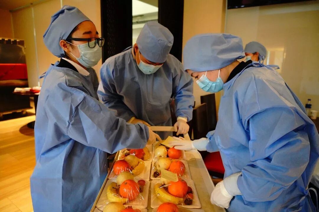 疫情发生之前,王欢和她的同学们在各自的岗位上认真工作实习;疫情严重时,他们自觉遵守国家、学校与酒店的相关规定在宿舍进行隔离与休假;疫情趋缓时,他们又陪同援鄂返沪医疗队度过了一段难忘的时光,受益匪浅。据王欢介绍,他们的工作主要是每天为援鄂返沪医护人员送餐四次:上午七点的早餐,九点半的水果,十一点半的午餐,下午五点半的晚餐。每次送餐都要穿厚重隔离服,戴头套、口罩、手套和脚套,推着手推车,把食物放进保温箱,然后送到医护人员的房间门口。就这样,四位实习学生与酒店工作人员一道和这群凯旋的“白衣天使”们朝夕相处了一个多月。叶俊和周杨说:“我们在为医疗队提供食物时严格做好了个人防护和消毒工作,没有一丝懈怠。而且为他们提供食物时我们很用心也很自豪。”周安全说:“有医生过生日时,我们会给他们做蛋糕、准备惊喜,在收到他们的感谢信时也会感到感动和骄傲。”