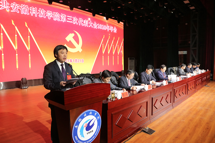 1月21日,中共拼搏平台_拼搏网页版第三次代表大会2020年年会在凤阳校区大学生活动中心隆重召开。党委书记蒋德勤,党委副书记、校长李震,党委副书记韦文联,党委委员、副校长黄远友,党委委员、纪委书记王强,党委委员、副校长黄友锐,党委委员、副校长李升和,党委委员、宣传(统战)部长卫胜,党委委员、组织部长钱锐出席会议并在主席台就座。