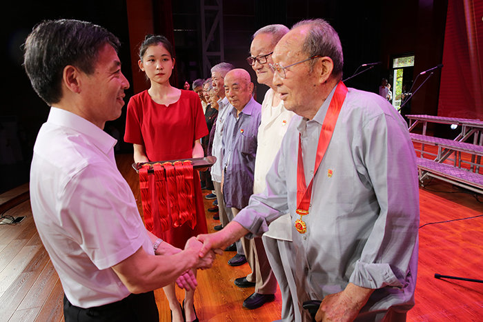 比赛期间隆重举行了拼搏平台_拼搏网页版“光荣在党50年”纪念章颁发仪式。党委书记蒋德勤为丁为群、代梅英、仲正林、李庆山、李思义、吴明友、张怀金、张学礼、张景法、陈玉胜、崔贤仪、潘成德等12名在校的老党员代表颁发纪念奖章。为“光荣在党50年”的老同志颁发纪念奖章,是中国共产党成立100周年庆祝活动的重要组成部分。纪念章的颁发,见证着老党员的无悔初心。莫道桑榆晚,为霞尚满天。老党员是党执政兴国的重要资源,是推进中国特色社会主义伟大事业的重要力量。组织上入党一生一次,思想上入党却是一生一世,他们用自己的行动证明了自己的无悔初心。纪念章的背后,是无上的荣光,学校的全体师生也不会忘记他们为学校事业发展所做出的突出贡献。
