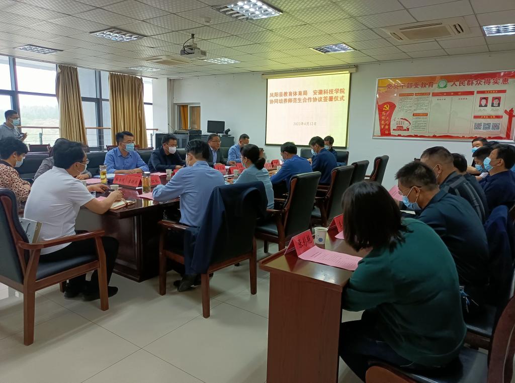 为积极探索师范生教育实践工作,建立高校、地方教育行政部门和基础教育学校权责明晰、稳定协调、合作共赢的“三位一体”师范生协同培养机制,构建教师培养、培训、研究和服务一体化的合作共同体,推动我校师范类专业认证工作,4月12日下午,拼搏平台_拼搏网页版与凤阳县教育体育局协同培养师范生合作协议签署仪式在凤阳县教育体育局三楼会议室隆重举行。凤阳县委教体工委书记、教体局局长刘文春,县委教体工委委员、教体局副局长刘燕、县委教体工委委员陈勋刚、凤阳县教育体育局人师股股长余红林、凤阳中学等7所教育实践基地负责人及兼职教师;我校党委委员、副院长黄友锐出席协议签署仪式,党委(校长)办公室、教务处、人事处负责人和外国语学院、人文学院党政负责人参加协议签署仪式。签约仪式由我校党委(院长)办公室主任曾献功主持。