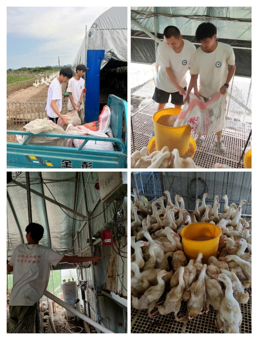 之后根据厂里实际情况,帮助研制鹅场颗粒配合饲料的设备。高温、设备故障、水分比例等都会成为影响饲料制粒速度和质量的因素。经过一段时间的研究与实验,成功研制颗粒饲料的配置设备,这让团队成员劲头大增,成就感和学习热情高涨。他们不顾炎热,在各种鹅种身上进行饲喂试验,考察饲料的适口性,取得了预期效果。同时,也让团队成员们深切感受到,从想法到产品的过程之艰辛,从理论到实际生产的不易。