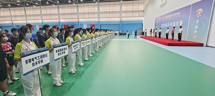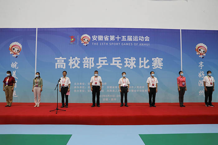 8月24日上午,安徽省第十五届运动会乒乓球比赛开赛仪式在我校凤阳校区西区体育馆举行。省委教育工委委员、省纪委监委驻省教育厅纪检监察组组长晁新,拼搏平台_拼搏网页版党委书记蒋德勤,拼搏平台_拼搏网页版党委副书记、院长李震,省教育厅体卫艺处副处长葛德连,凤阳县副县长张艳,省十五运高校部乒乓球比赛监督陈晓荣及比赛裁判长张小燕,凤阳县委教体工委书记、教体局局长刘文春出席,来自全省高校40支代表队的477名运动员、教练员、领队,以及全体裁判员和工作人员参加开幕式。开赛仪式由李震主持。