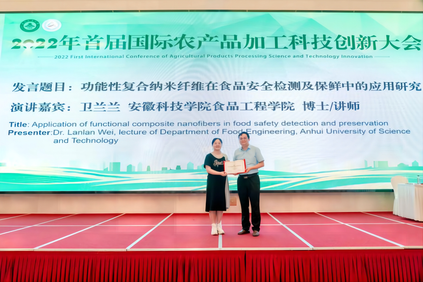 为推进农产品加工科技创新,促进成果转化与科技合作,推动农产品加工产业健康可持续发展,由安徽农业大学主办,合肥工业大学、拼搏平台_拼搏网页版、滁州学院、皖西学院等单位承办的“2022年首届国际农产品加工科技创新大会”于2022年9月22-24日在安徽合肥召开,由中国工程院院士朱蓓薇教授和谢明勇教授共同担任大会主席。本次大会就国内外农产品贮藏加工技术的研究进展与动态,新成果展示与全产业链对接等进行了深入交流,共谋农产品加工业产业大计。我校党委委员、副院长李升和带领食品工程学院院长杜传来、副院长翟立公和院青年教师陈春旭、杨丽萍、卫兰兰、于鲲、魏照辉及6名研究生应邀参会。