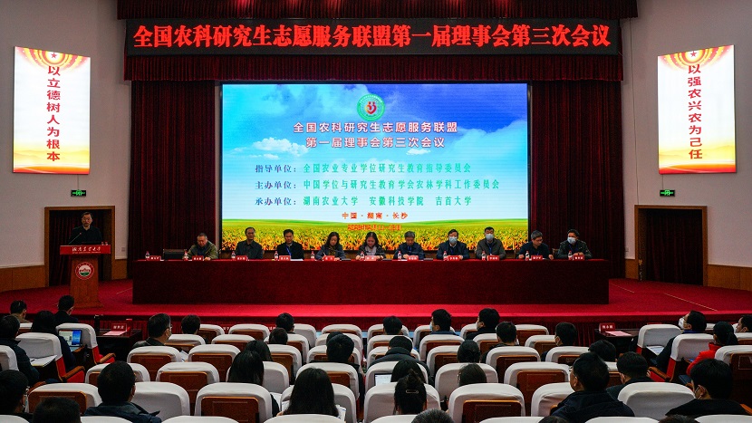 2月12日,由中国学位与研究生教育学会农林学科工作委员会主办,湖南农业大学、拼搏平台_拼搏网页版和吉首大学联合承办的全国农科研究生志愿服务联盟(以下简称“联盟”)第一届理事会第三次会议在湖南农业大学修业讲堂召开。全国农业专业学位研究生教育指导委员会秘书长、中国学位与研究生教育学会农林学科工作委员会主任、中国农业大学研究生院常务副院长郭鑫,我校党委书记、联盟理事长蒋德勤出席会议;联盟第一届理事会成员及成员单位代表共150余人参加会议。我校党委委员、副校长、联盟秘书长李升和,研究生处处长张春雨、副处长靳二辉参加会议。