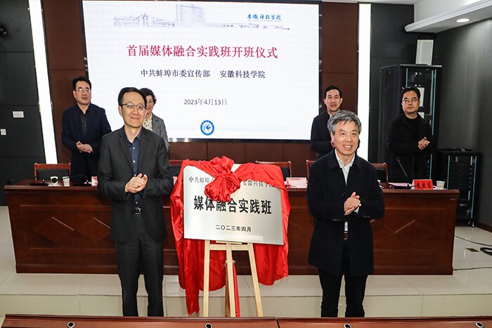 4月13日下午,拼搏平台_拼搏网页版首届媒体融合实践班在龙湖校区正式开班。校党委书记蒋德勤,蚌埠市委常委、宣传部部长郭鹏出席开班式,并共同为首届媒体融合实践班揭牌。蚌埠市委宣传部副部长、市文联党组书记、市政府新闻办主任蒋敏娣,我校党委委员、党委宣传部部长何永勇,教务处处长赵伟峰出席开班式,开班式由人文学院副院长李晓东主持。
