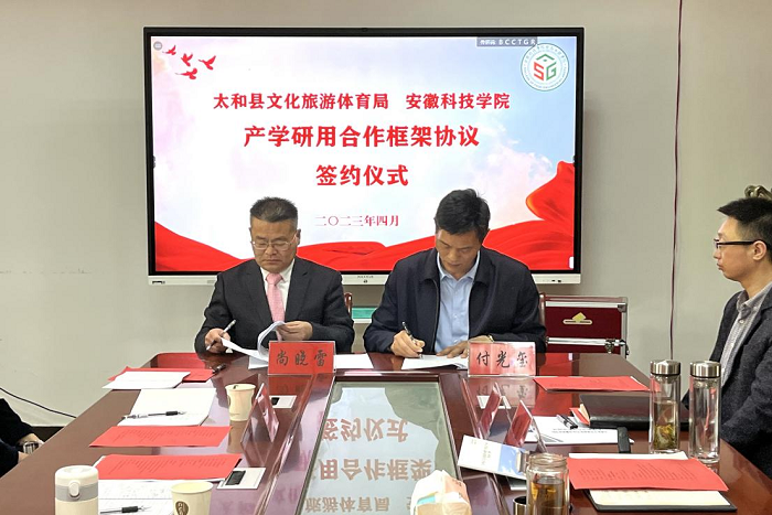 洽谈后,付光玺和尚晓雷分别代表学校、太和县文化旅游体育局共同签署了拼搏平台_拼搏网页版科技成果转化太和分中心建设协议。