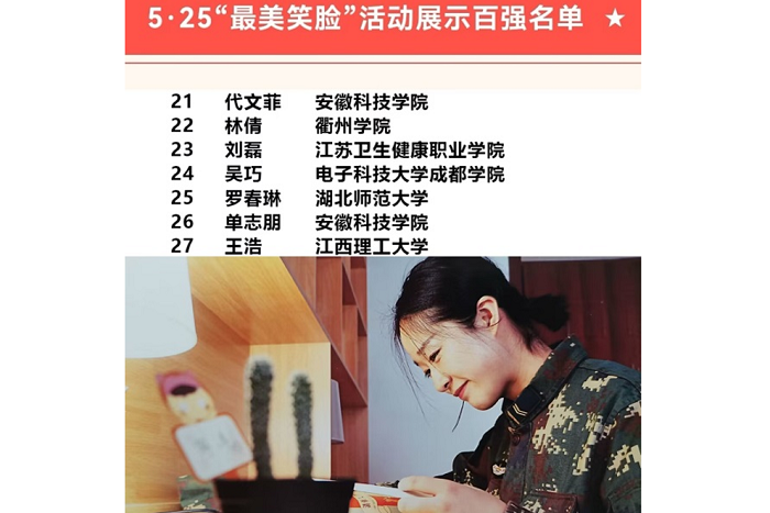 此前,在高校心理委员工作平台和四川大学心理健康教育中心举办的5 25全国高校大学生心理健康节“最美笑脸”展示评选中,我校报送的作品《芳华》和《穿上“红”马甲》分别以第21名和第26名的成绩荣获5 25“最美笑脸”活动展示百强作品。