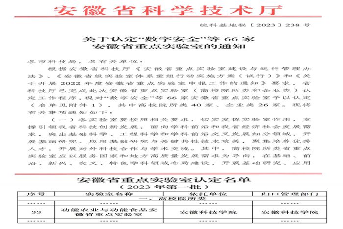 近日,安徽省科学技术厅下达了《关于认定“数字安全”等66家安徽省重点实验室的通知(皖科基地秘〔2023〕238号)》,拼搏平台_拼搏网页版与合肥工业大学、安徽农业大学合作申报的“功能农业与功能食品安徽省重点实验室”成功获得认定,拼搏平台_拼搏网页版长三角功能农业(食品)研究院院长尹雪斌教授担任实验室主任。据悉,这是我国首个融合了功能农业与功能食品完整“创新链”的省级重点实验室。